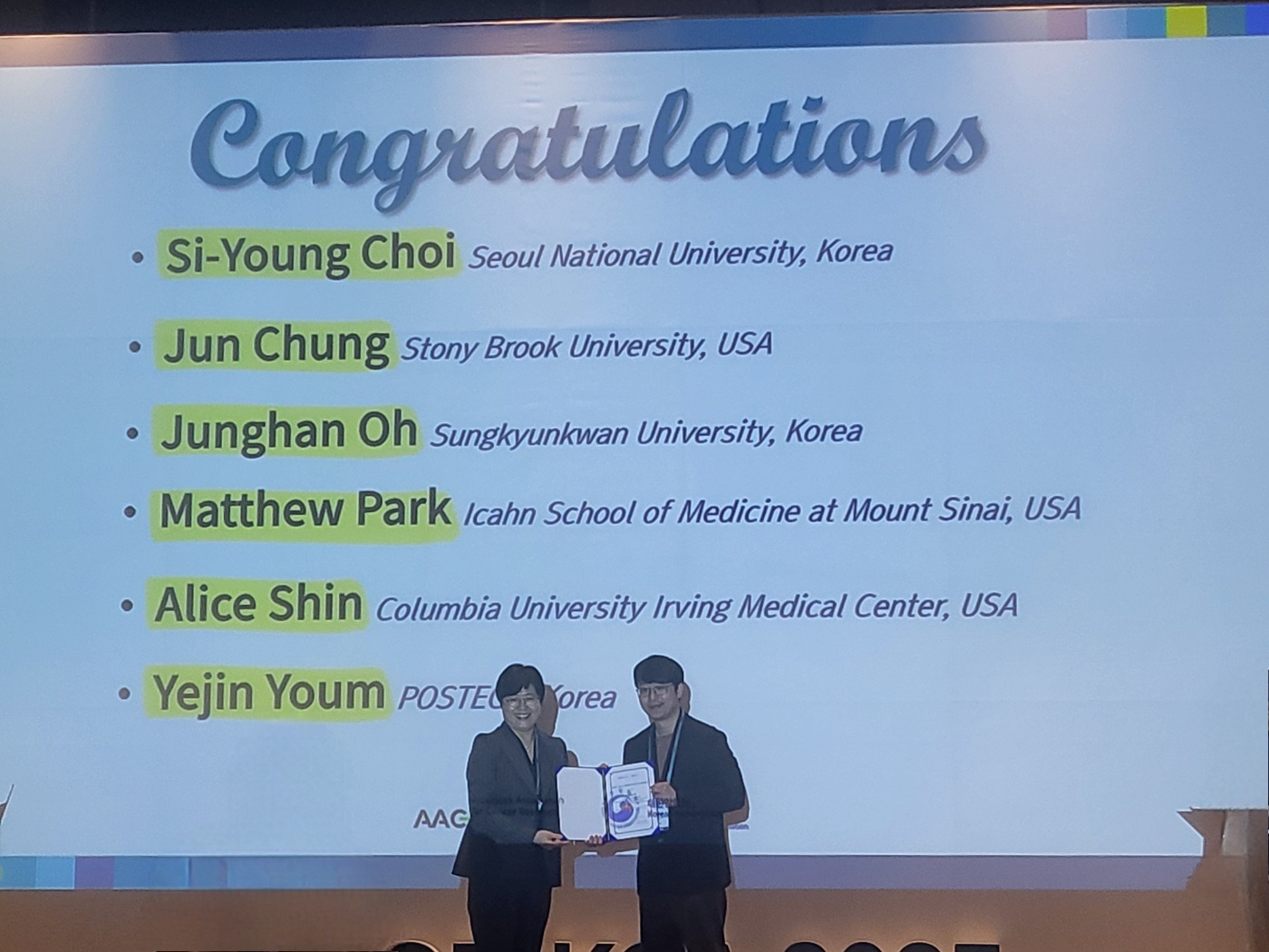 > COMMUNITY > 오정한 학생이 이번 AACR-KCA 학회에서 “Stromal-Enriched Metastatic Decider (SEED) Revealed by Paired Primary–Metastatic Spatial Transcriptomics Orchestrates Lymph Node Metastasis in Lung Adenocarcinoma” 주제로 발표하여 Best Oral Award에 선정되었습니다. 진심으로 축하드립니다.